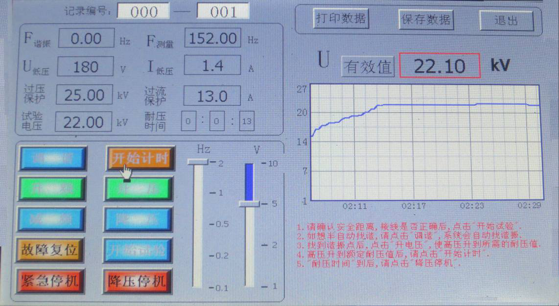 點擊“開始試驗”,如想自動找諧振點,點擊“調諧”,系統自動尋找諧振點,藍線代表電壓曲線,顯示界面如圖所示。