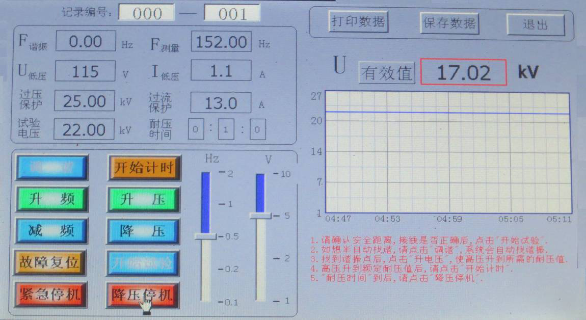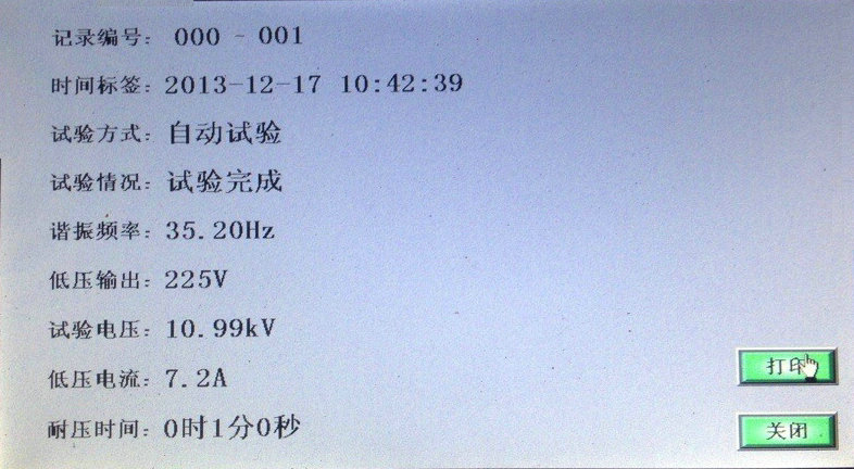 當U諧振電壓降壓0時,試驗完成,如想查詢試驗記錄,請在降壓前點擊保存數據,降壓后點擊“文件管理”; 顯示界面如圖所示。