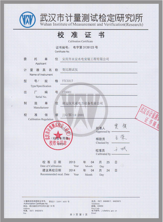 轉載:"YTC3317全自動變比組別測試儀鑒定證書" 請注明來源于儀天成電力。 更多技術問題請致電儀天成電力客戶服務:027-87876585,技術部專線:027-87876585,在線客服:719388481